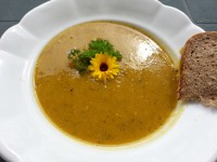 Sabji z mrkve a dýně hokkaido, rýže, mrkvová indická krémová polévka, salát s jedlými květinami a listovou zeleninou ze zahrádky (salát, rukola, špenát apod.) pečivo a ovoce. K pečivu místo pomazánky sladké ovocné rozvary, švestkový a jablečný s bylinkami.
