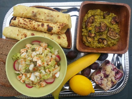 Mungový dál s grilovanými lilky a bramborové placky, salát z čínského zelí, ředkví, mrkve a lahůdkového tofu s olivami a kapari, chléb, ovoce a buchta.