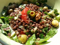 Široké nudle se zelím a uzeným tempehem, salát z ředkve, kedlubny a mrkve s marinovanýma olivama a oregánem, domácí chléb, pomazánka z celeru a mrkve se sojanézou, ovoce a ovocné smoothie...